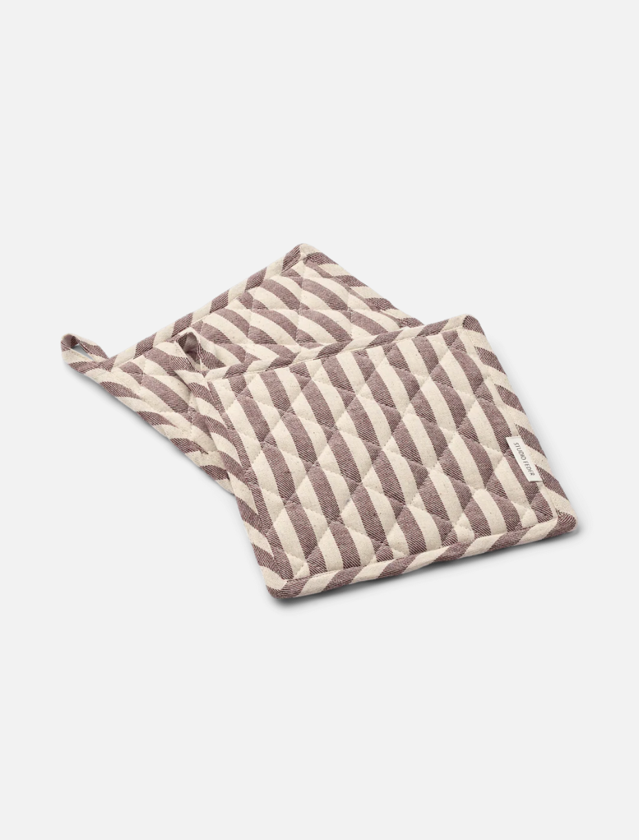 Grydelapper i hør-/bomuldblandning. Med en lille løkke til ophæng på en knage.