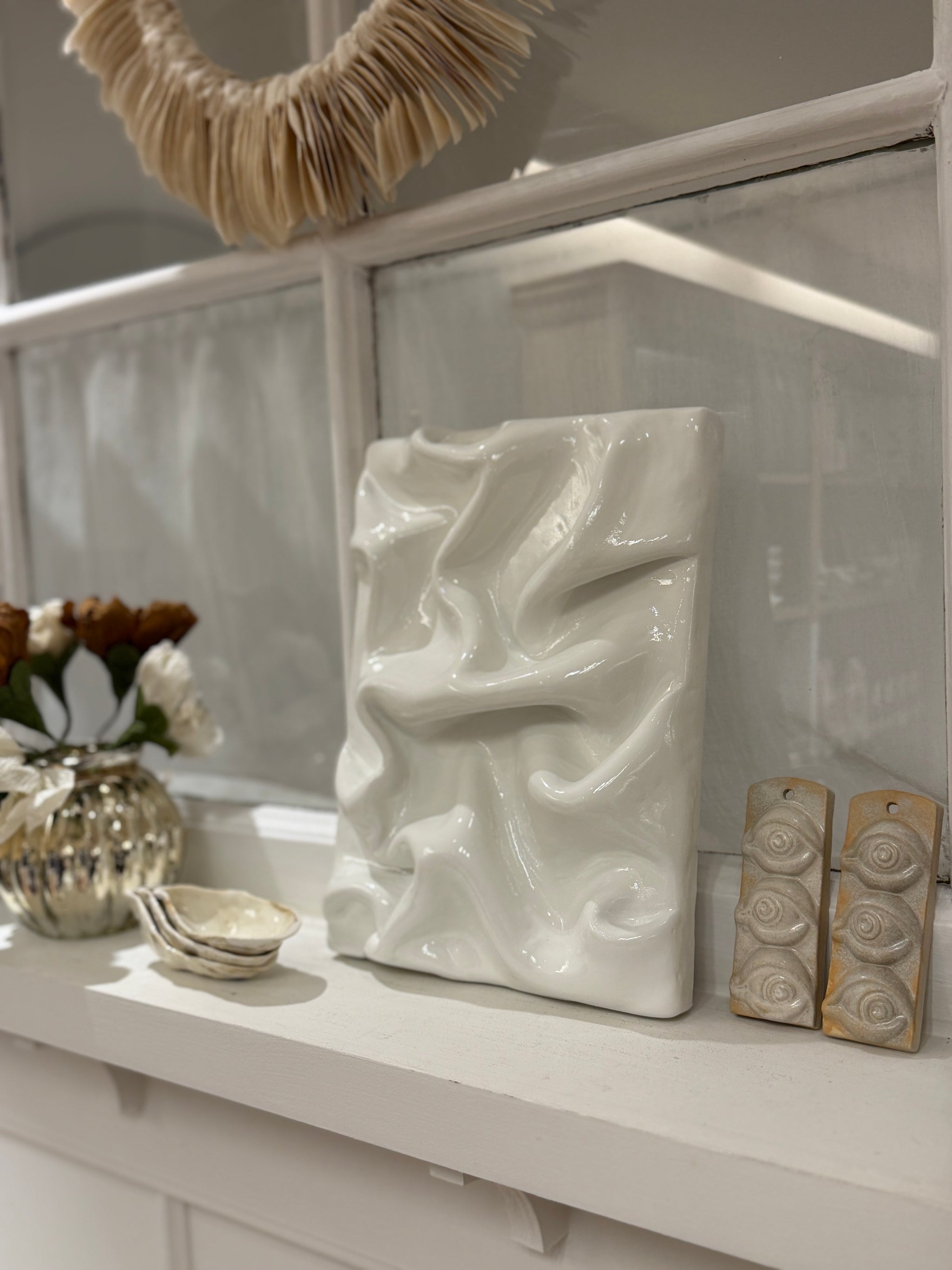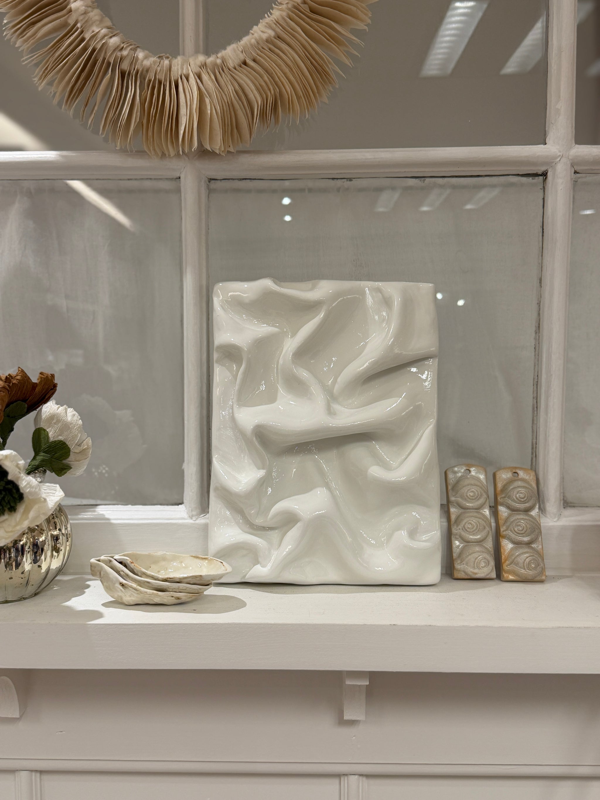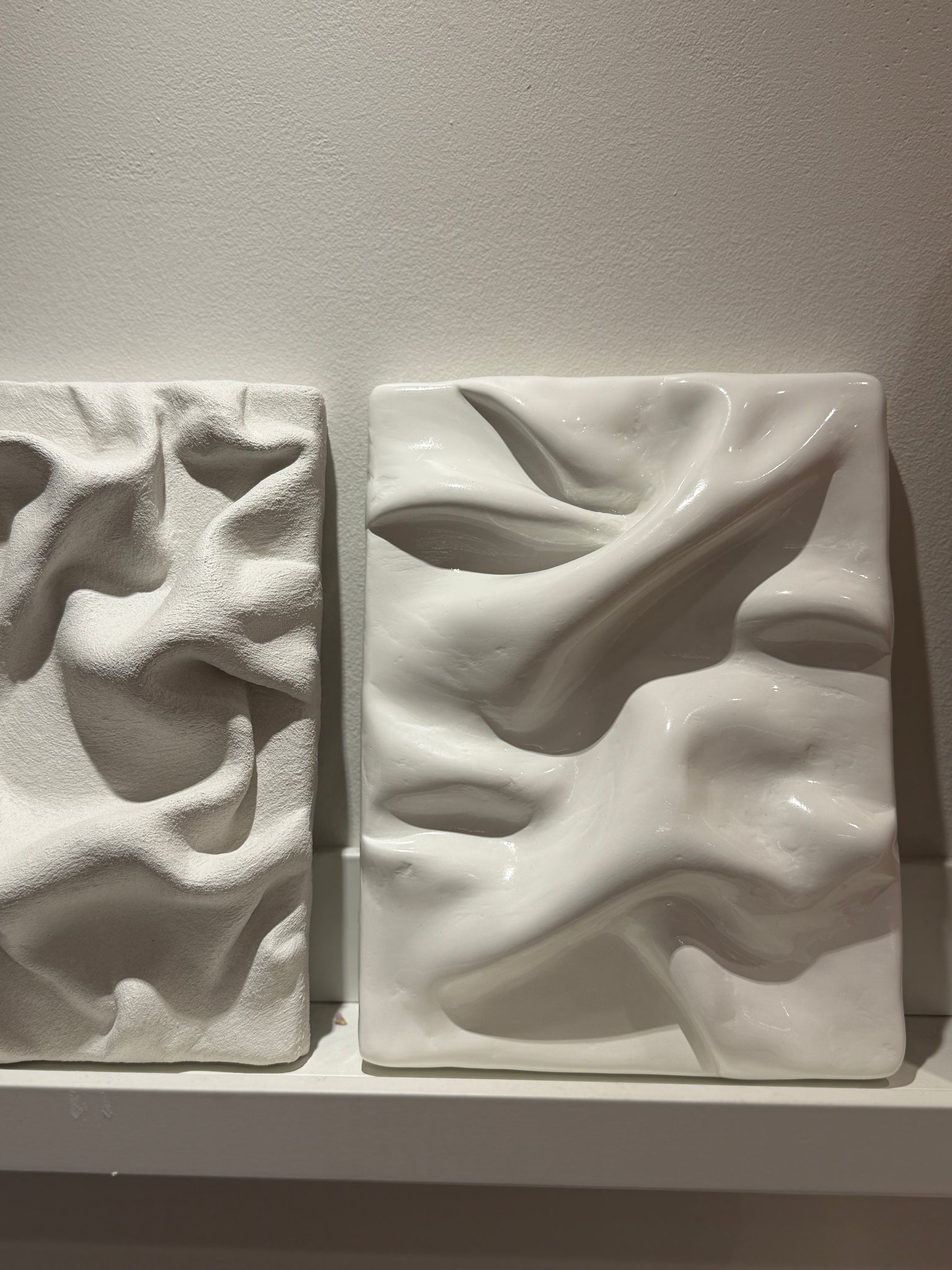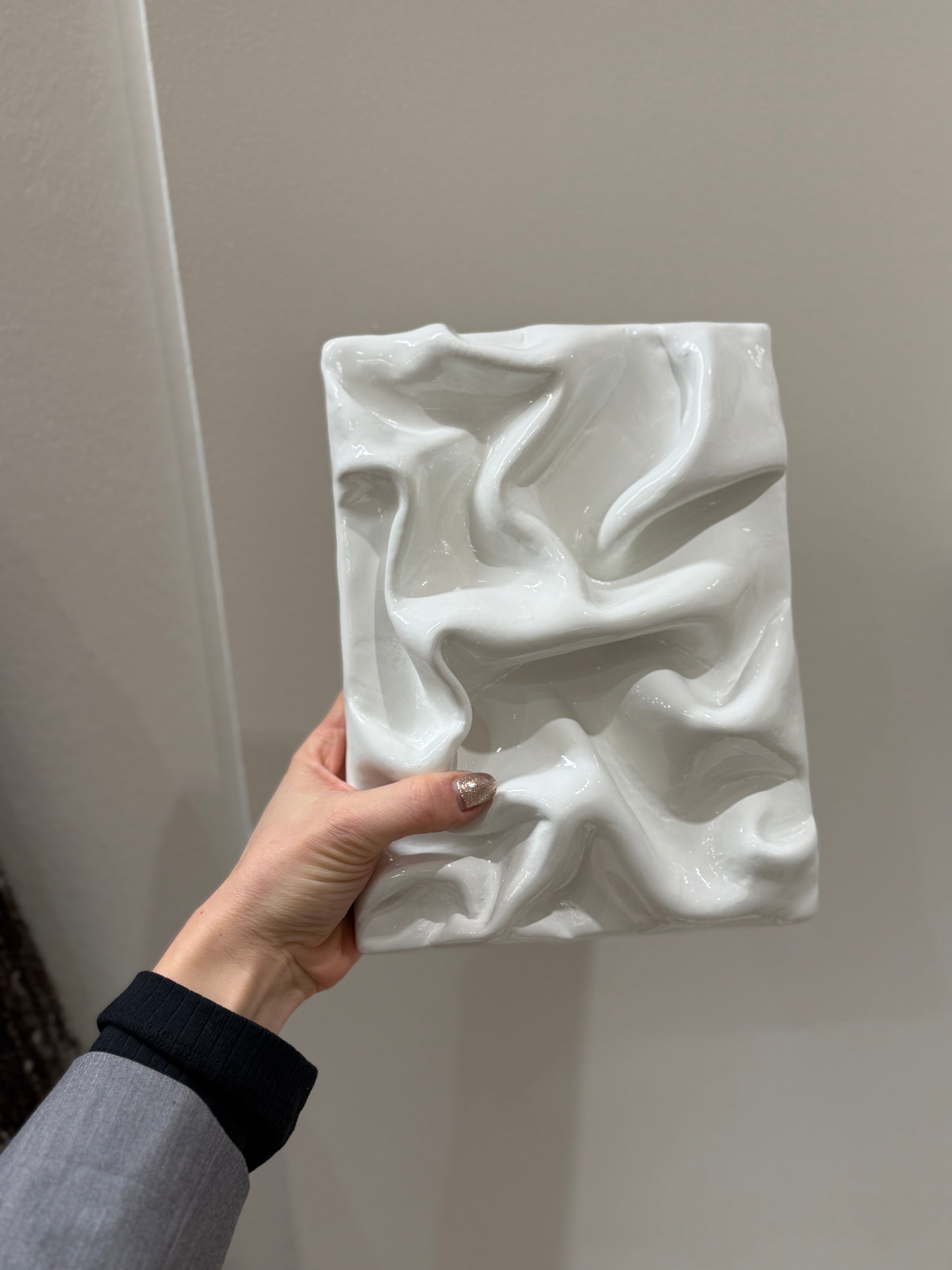Mini Clay er et håndformet værk af Sarah Kvejborg. De bløde, organiske folder skaber dybde og bevægelse i værket, og lyset fremhæver detaljerne forskelligt alt efter tidspunkt på dagen.