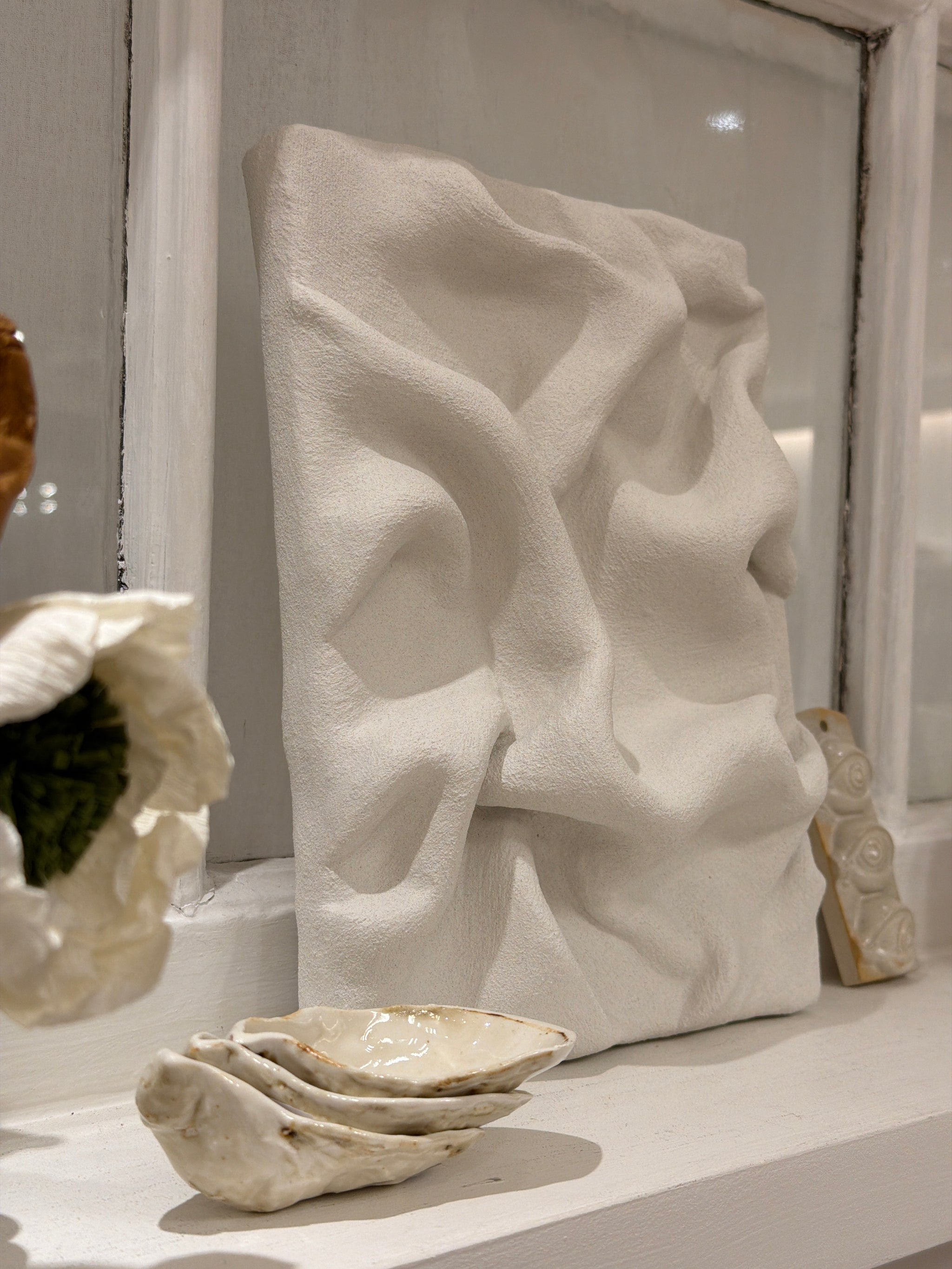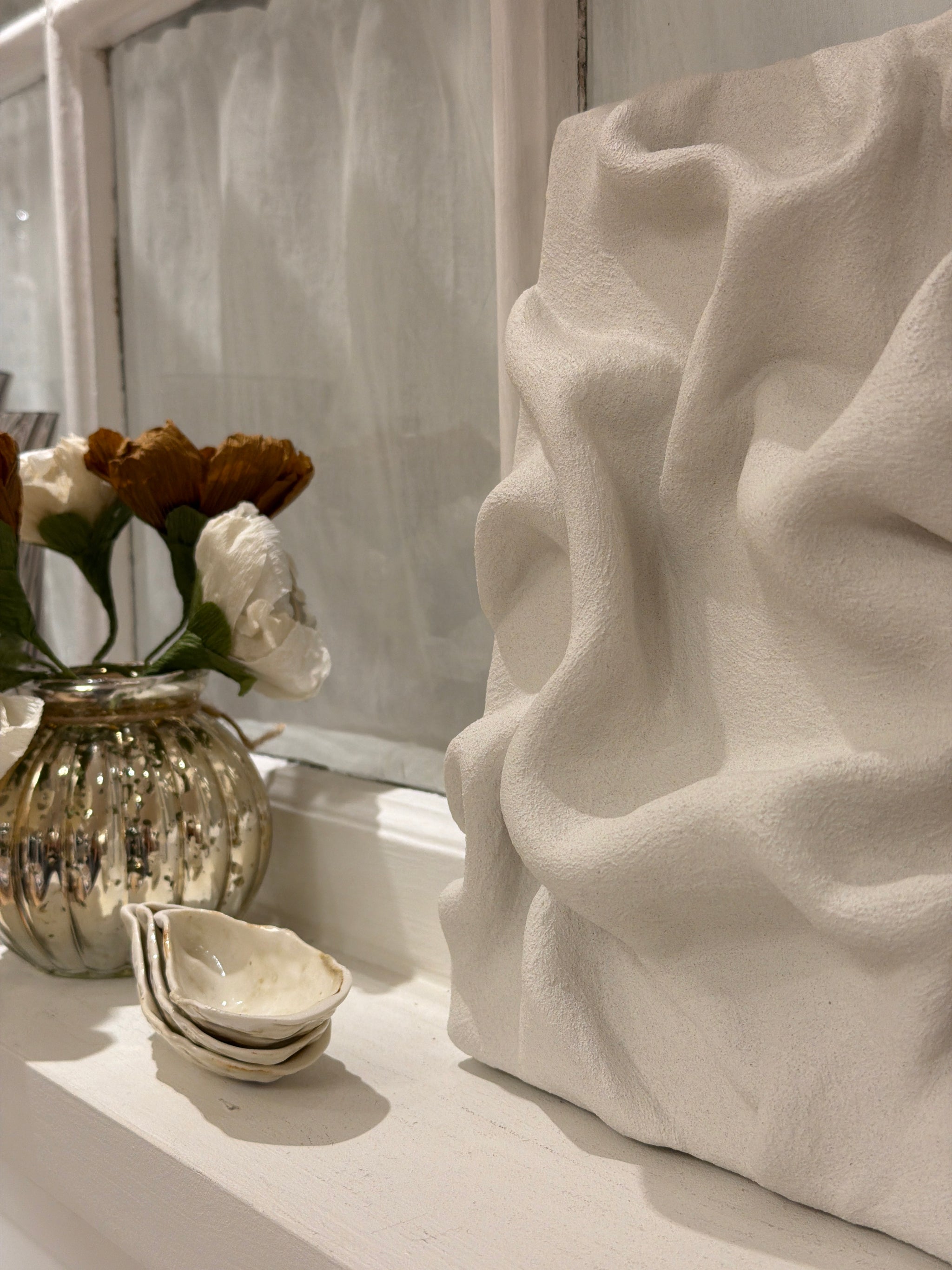 Mini Clay er et håndformet værk af Sarah Kvejborg. De bløde, organiske folder skaber dybde og bevægelse i værket, og lyset fremhæver detaljerne forskelligt alt efter tidspunkt på dagen.