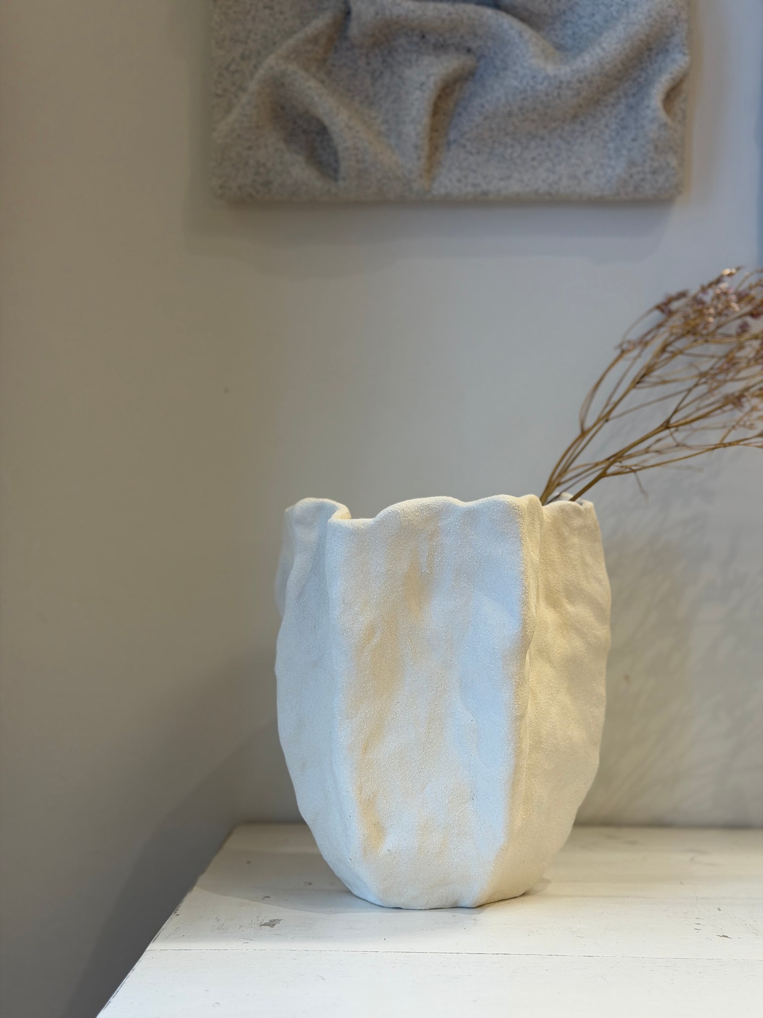 Håndbygget vase i stentøj med blød beige glasur, skabt af Leela Mette. Vasen har en levende, bølgende form med vertikale folder, der giver et sanseligt og næsten tekstilt udtryk. Overfladen er let mat med fine variationer i glasuren, som fanger lyset på en rolig måde.