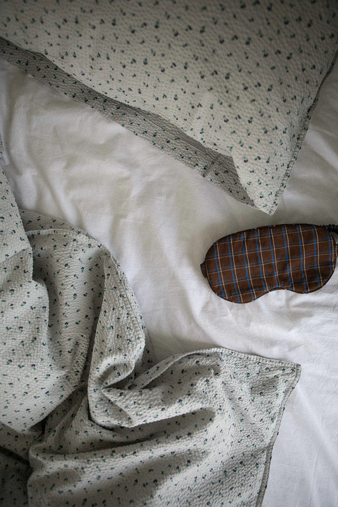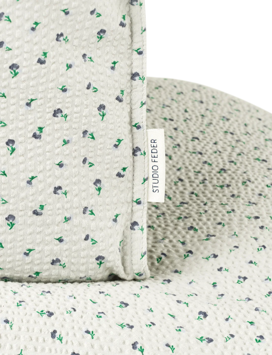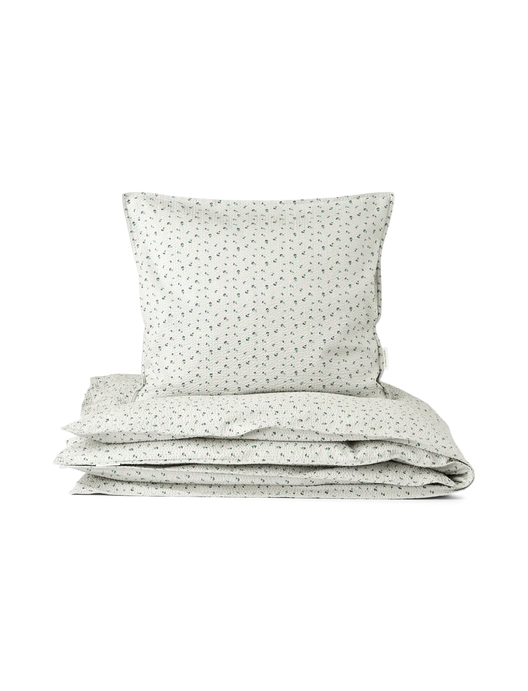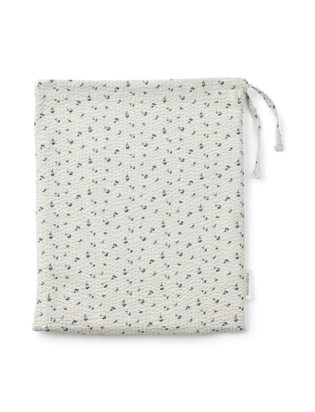 Sengetøjet leveres i en matchende stofpose, der lukkes foroven med bindebånd.