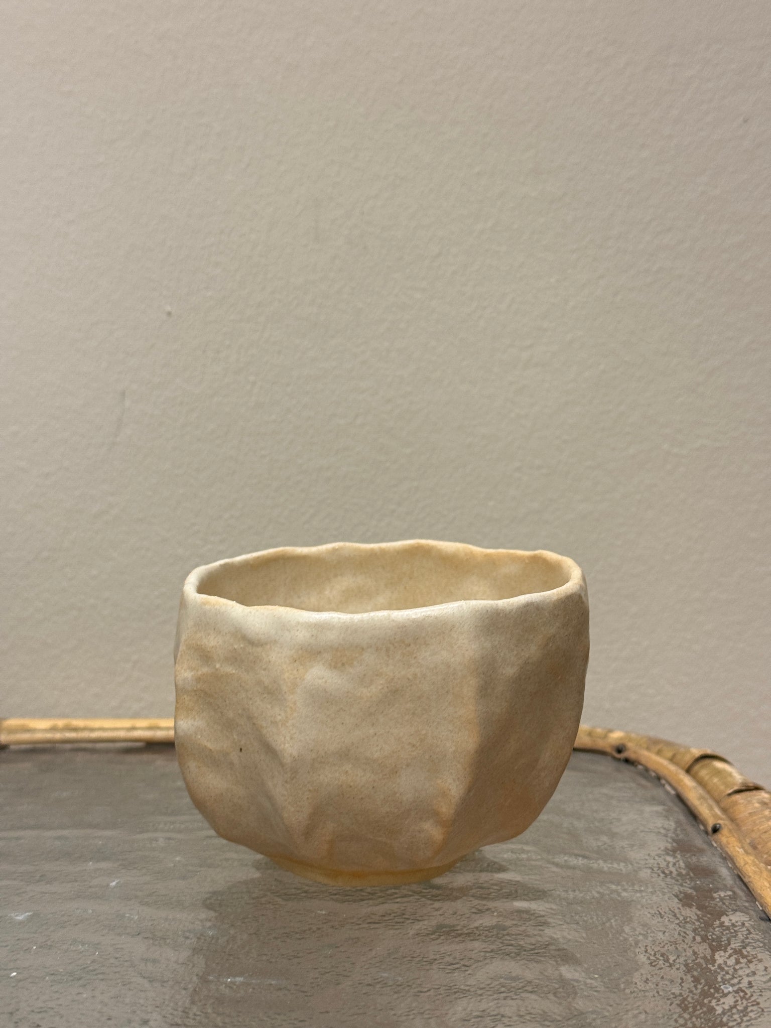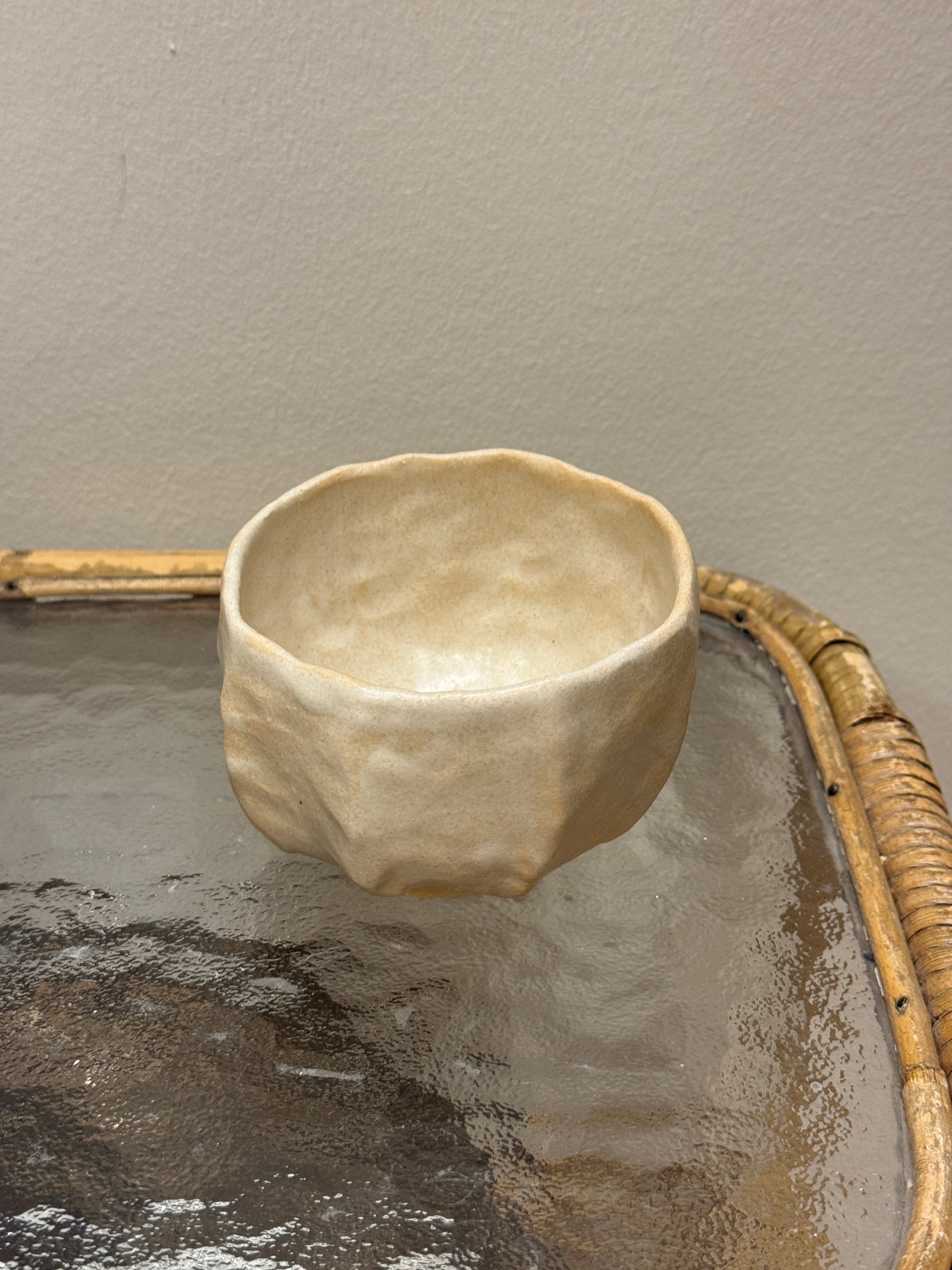 Håndbygget unika kop, af Leela Mette. Den er glaseret i en smuk beige silkemat glausur der giver en smuk effekt med brunleret.