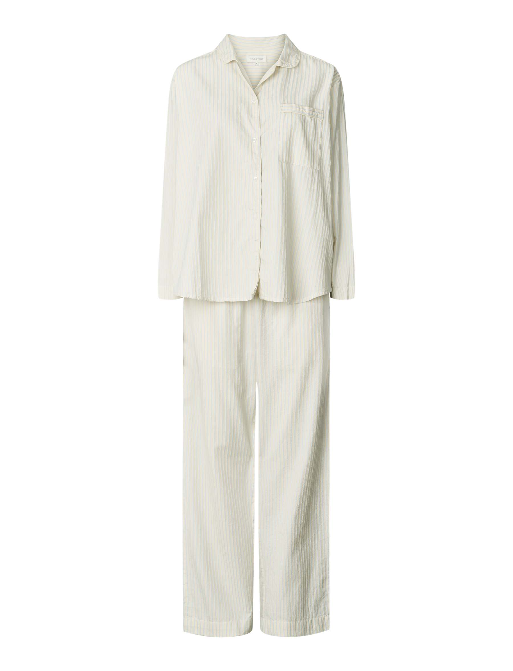 En klassisk, lækker og blød pyjamas, fremstillet i økologisk bomulds-poplin. Denne pyjamas er ikke kun fantastisk at sove i, men dens elegante design gør den også ideel til afslappede dage derhjemme.