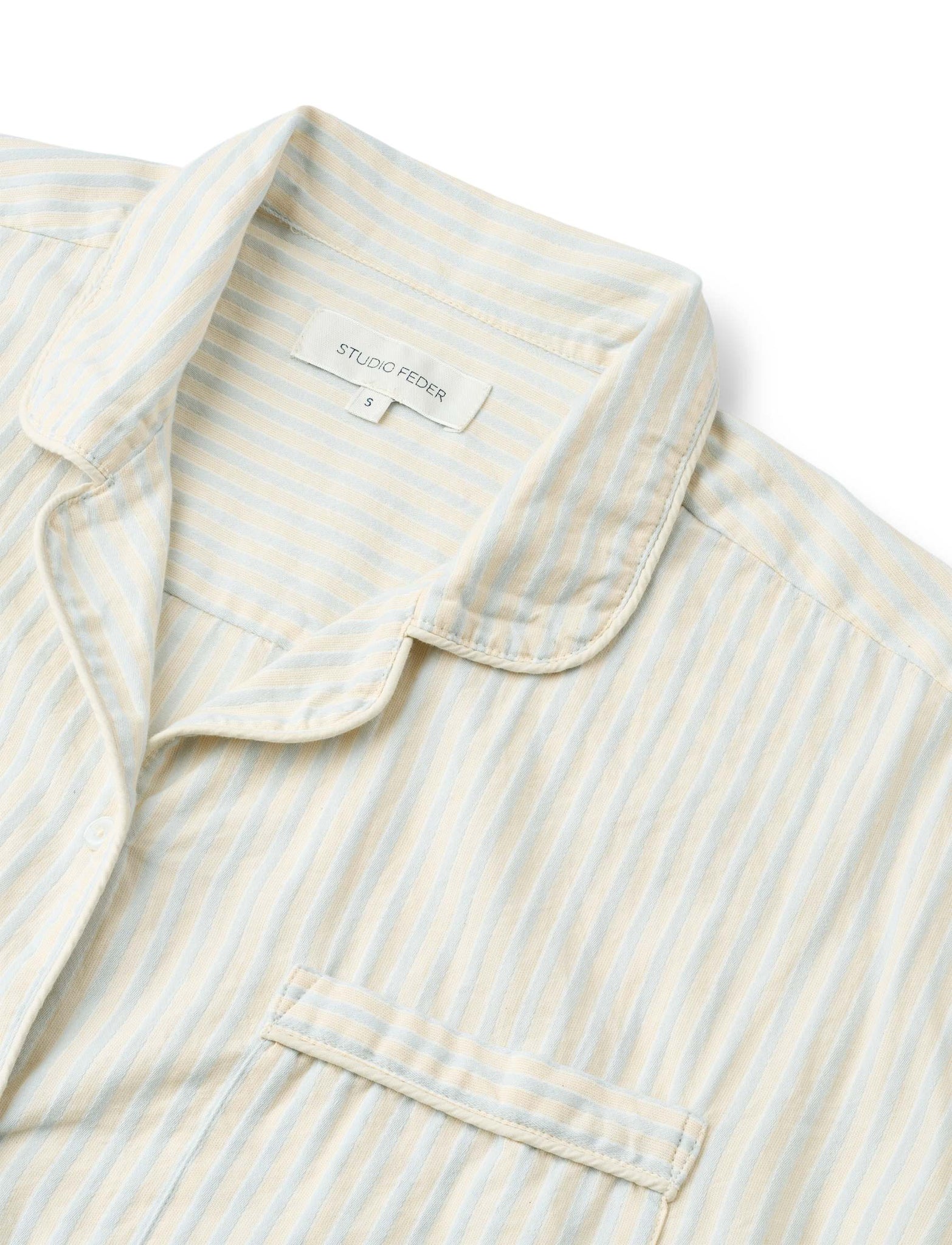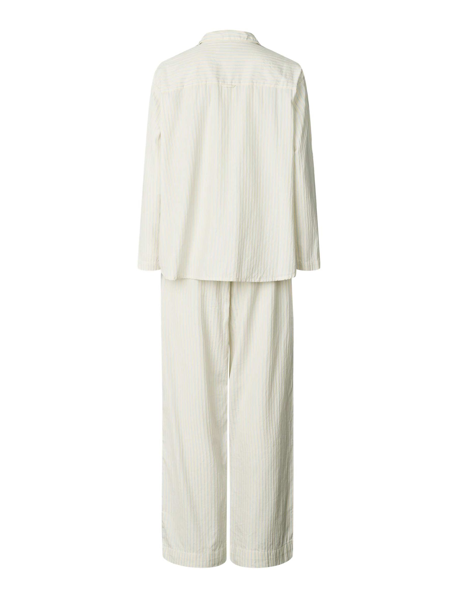 Pyjamashirten har en stor brystlomme, en knaplukning og en smuk kontrastbånd, der tilføjer et stilfuldt touch. Bukserne har en løstsiddende pasform med en elastisk talje og praktiske sidelommer, hvilket sikrer optimal komfort.