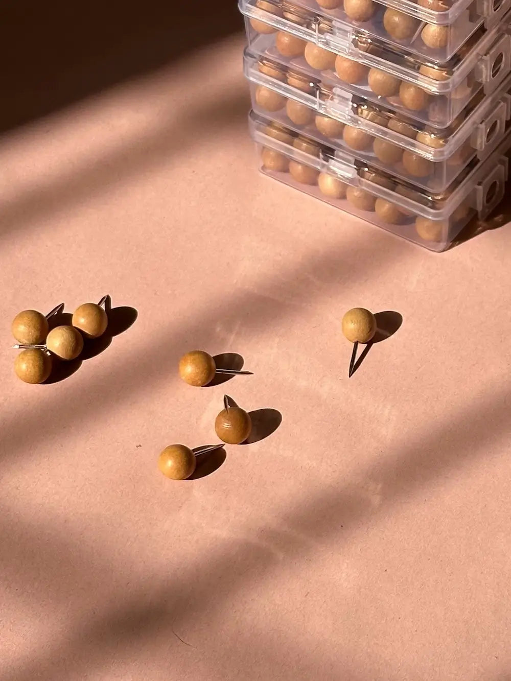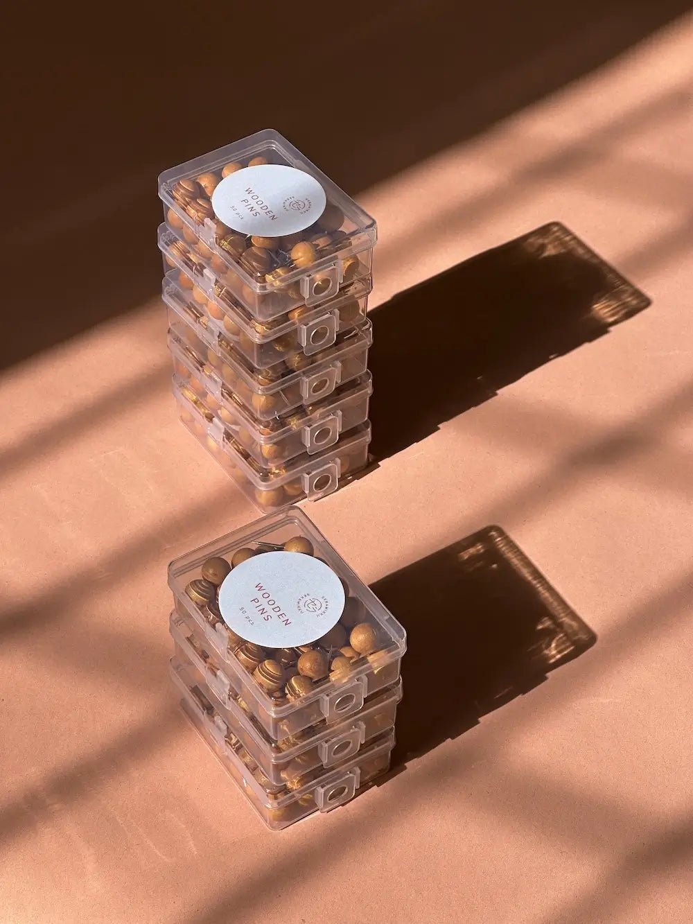 Knappenålene har et greb i træ, der gør dem nemme at anvende og fine at se på.
