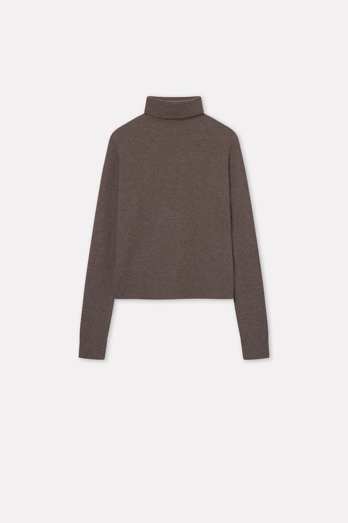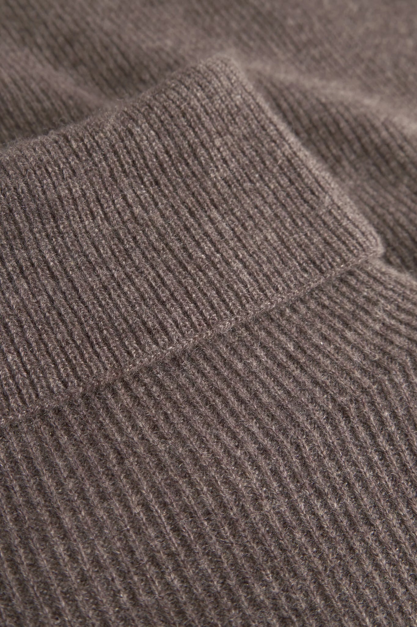 Forkæl dig selv med underspillet luksus i denne ribstrikkede sweater i en rolig taupe nuance. Sweateren har høj hals og let sænkede skuldre, som giver et elegant og arkitektonisk udtryk med tydelig nordisk inspiration. Perfekt til dig, der sætter pris på gennemtænkt design og naturlige materialer.