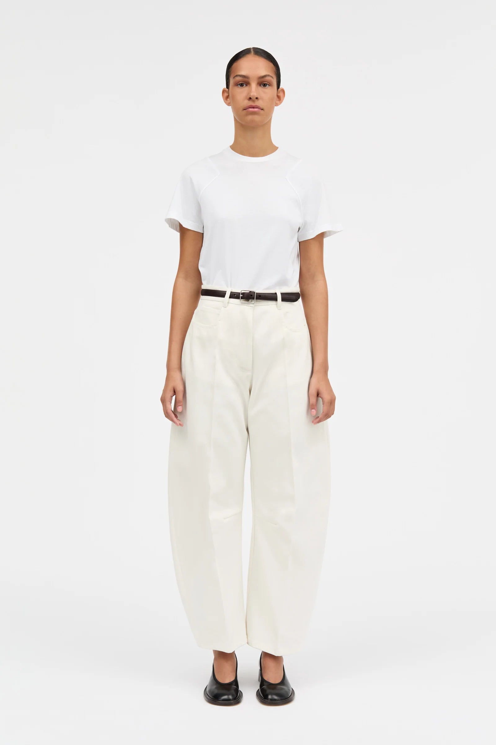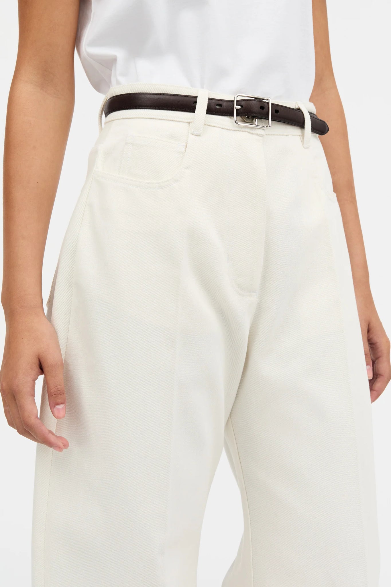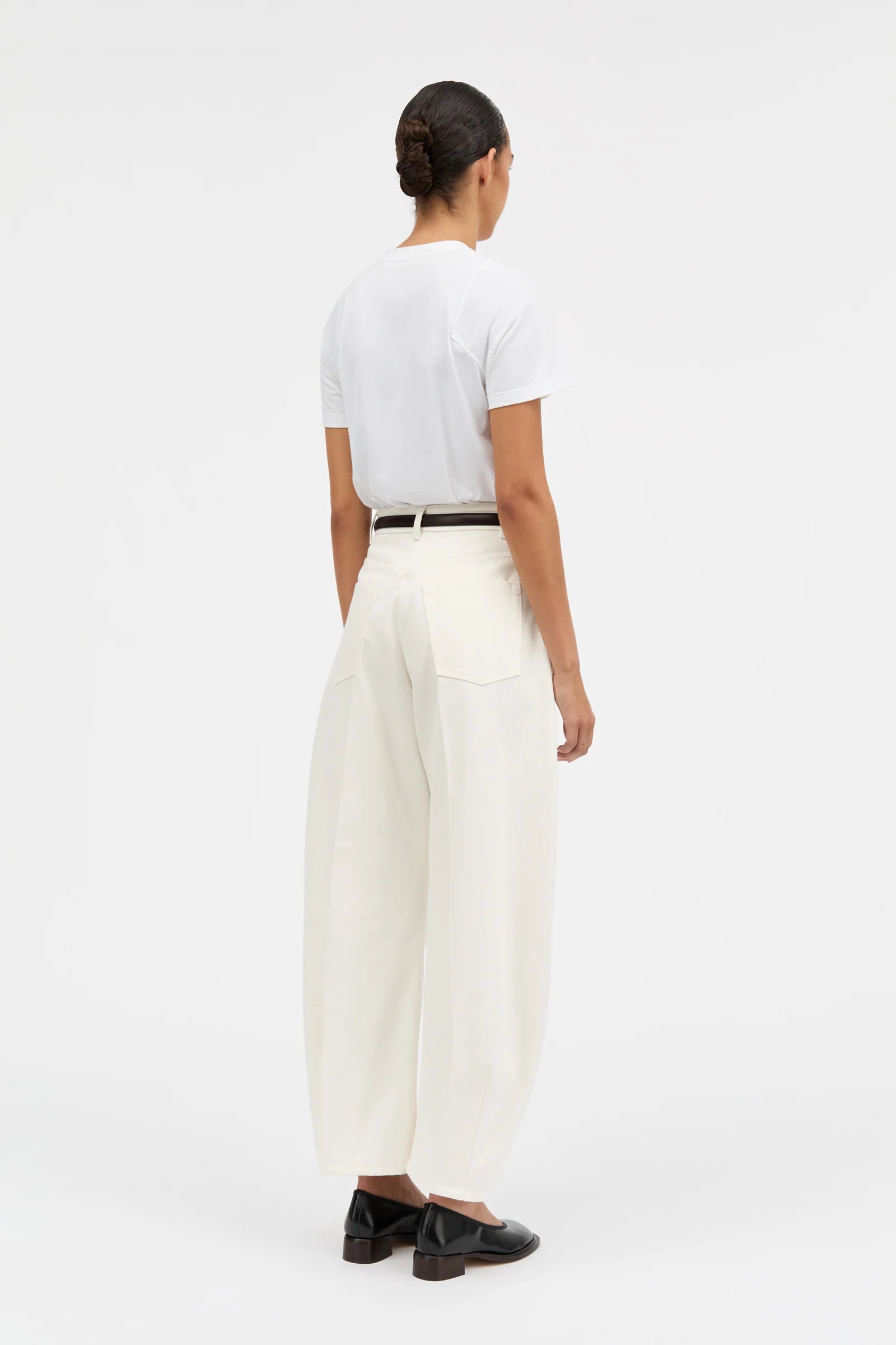 Pella-buksen fra MKDT er en moderne denim-fortolkning med cropped længde og en afslappet barrel leg-pasform, som giver et både cool og sofistikeret udtryk. Designet er enkelt, men har fine denimdetaljer, der løfter looket og giver bukserne karakter.