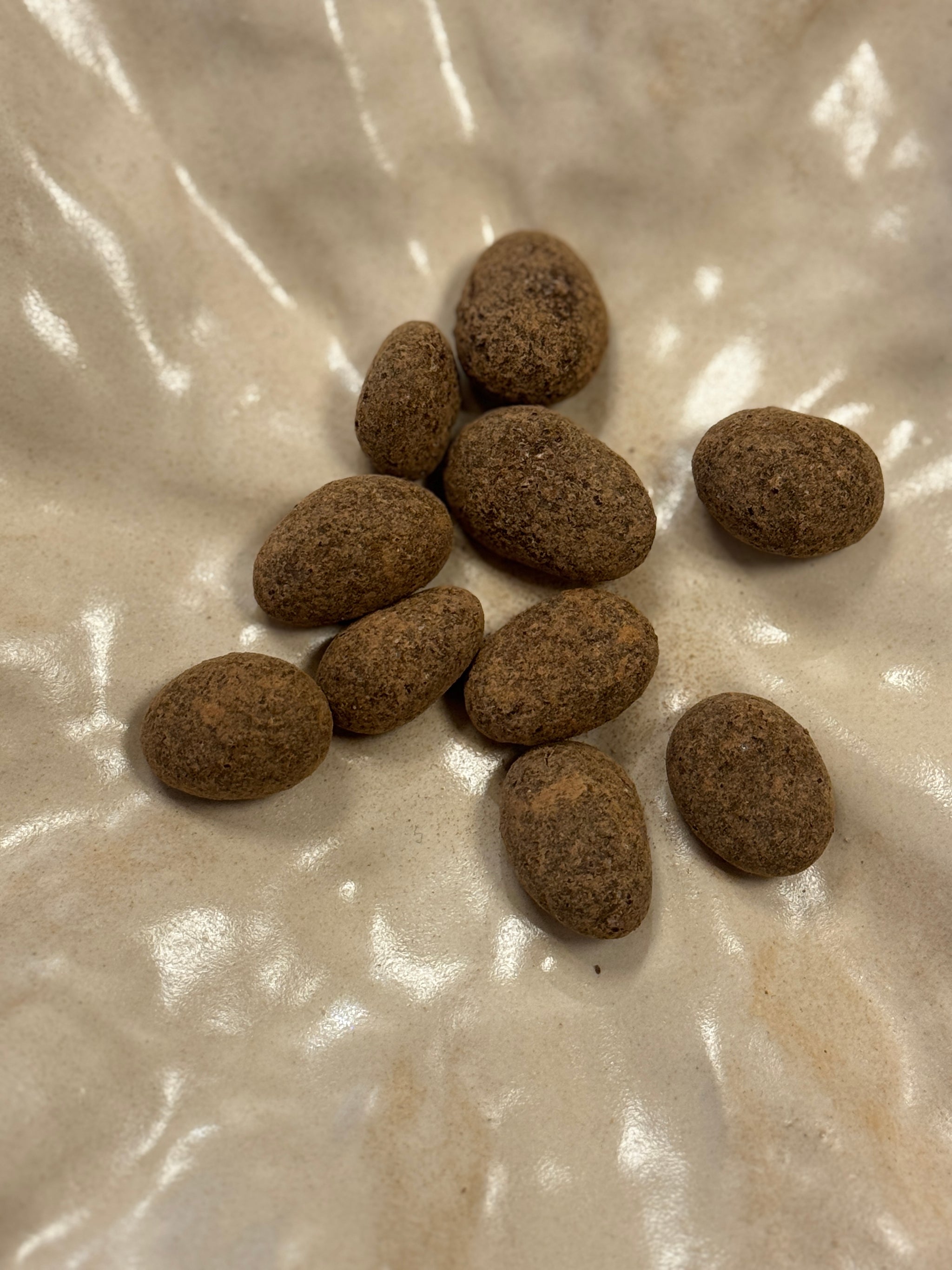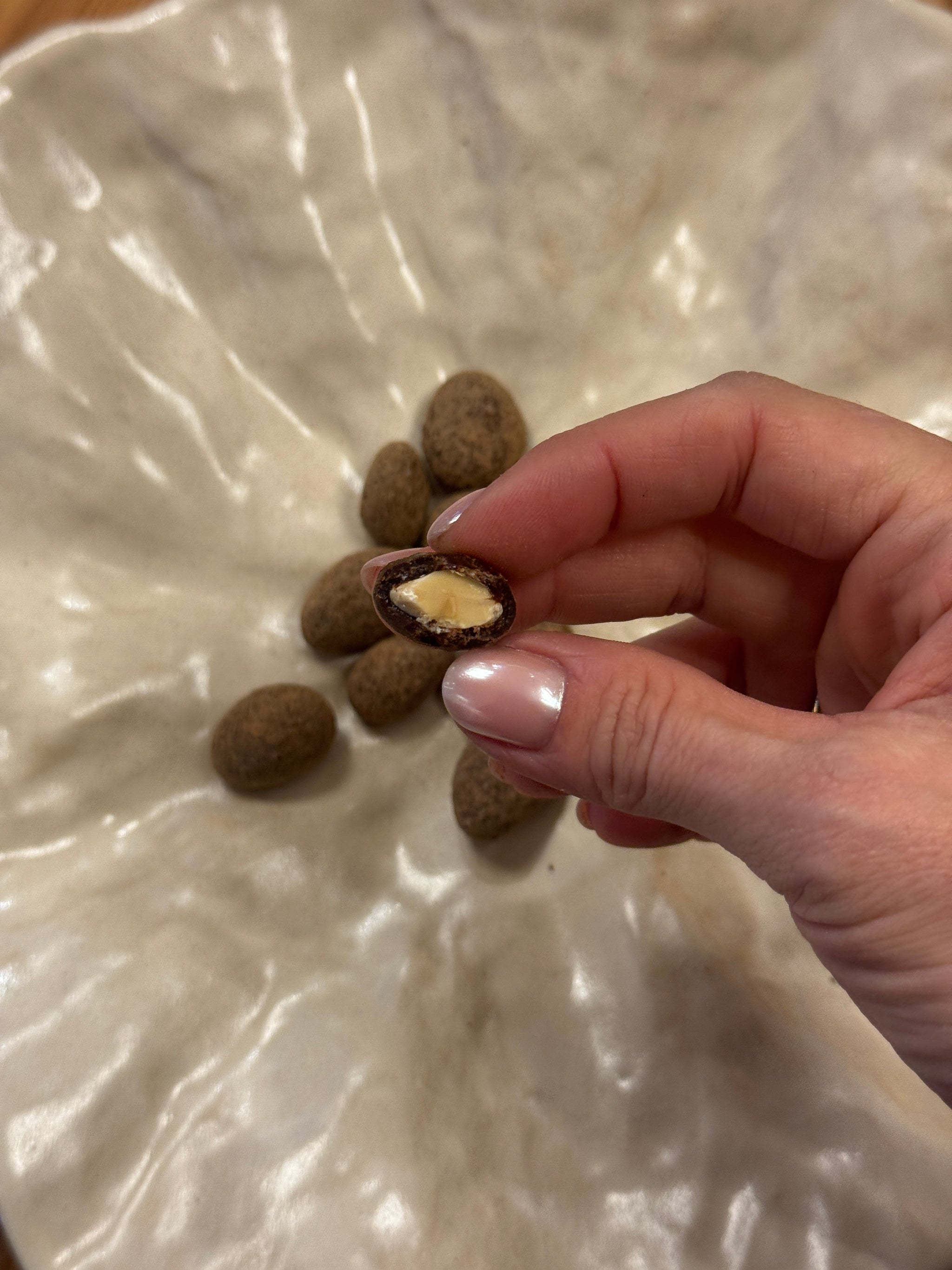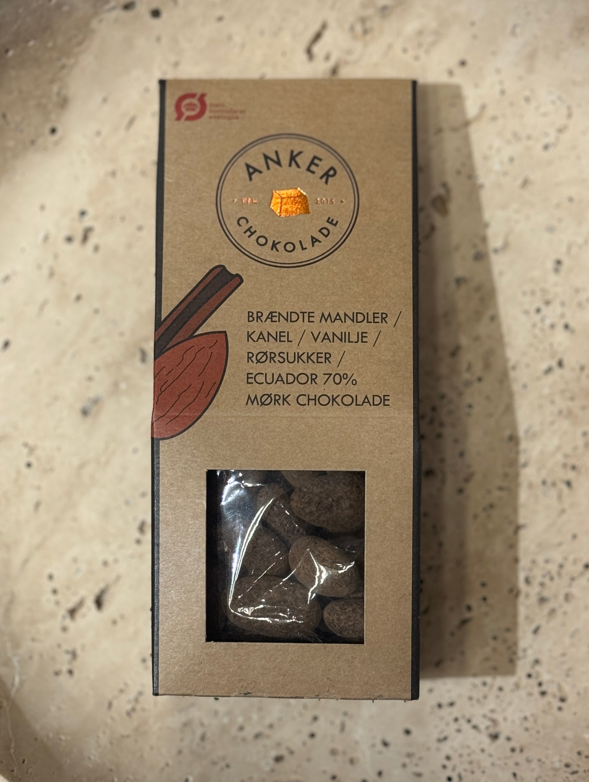 Lækre, sprøde Valencia-mandler ristet med rørsukker, kanel og vanilje – herefter overtrukket med 70% mørk chokolade fra Ecuador.