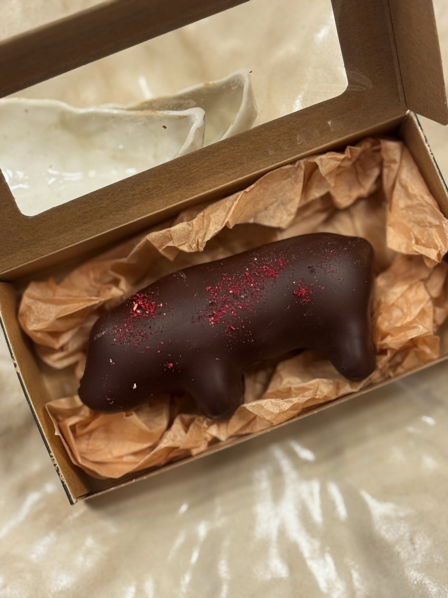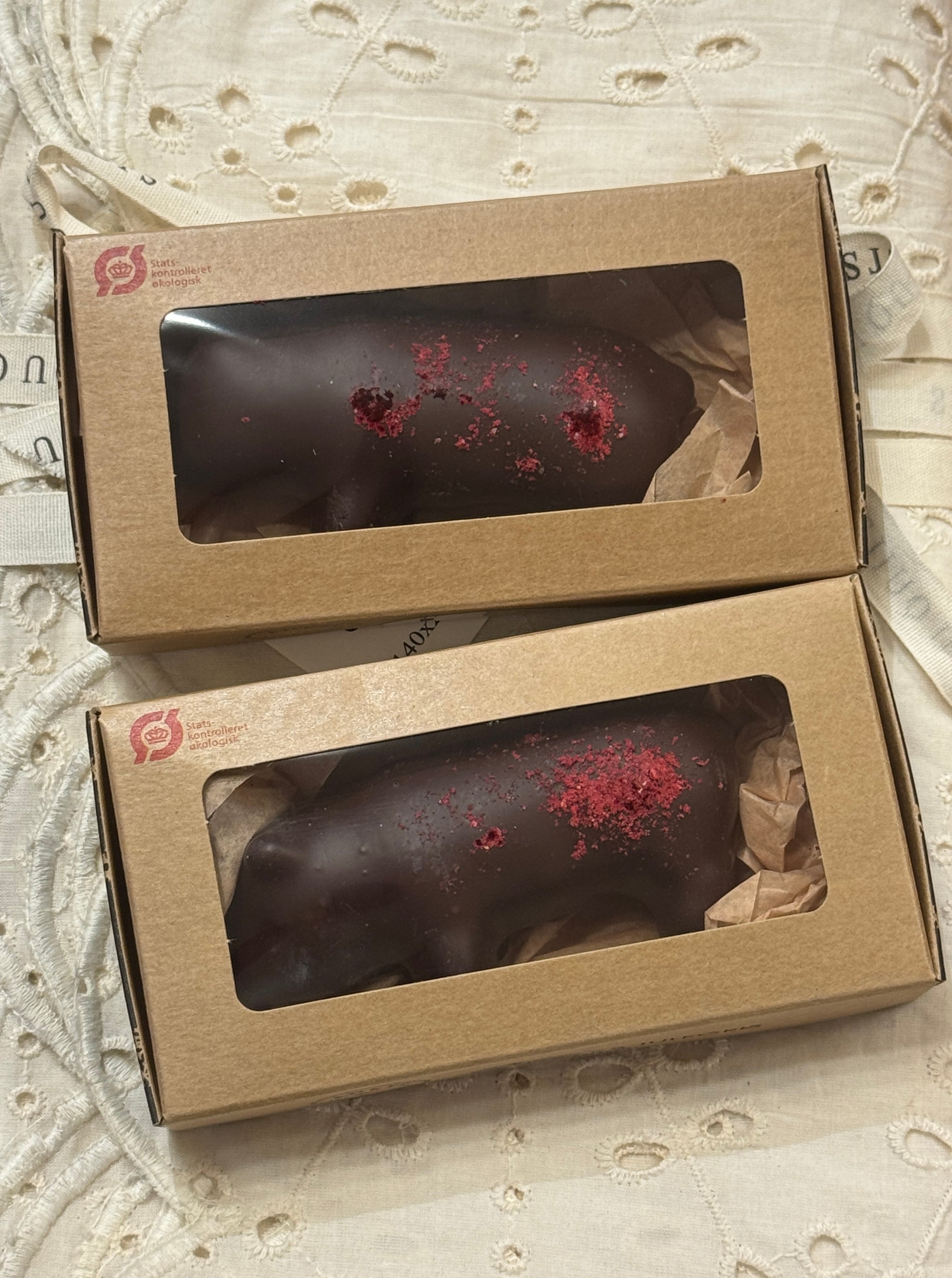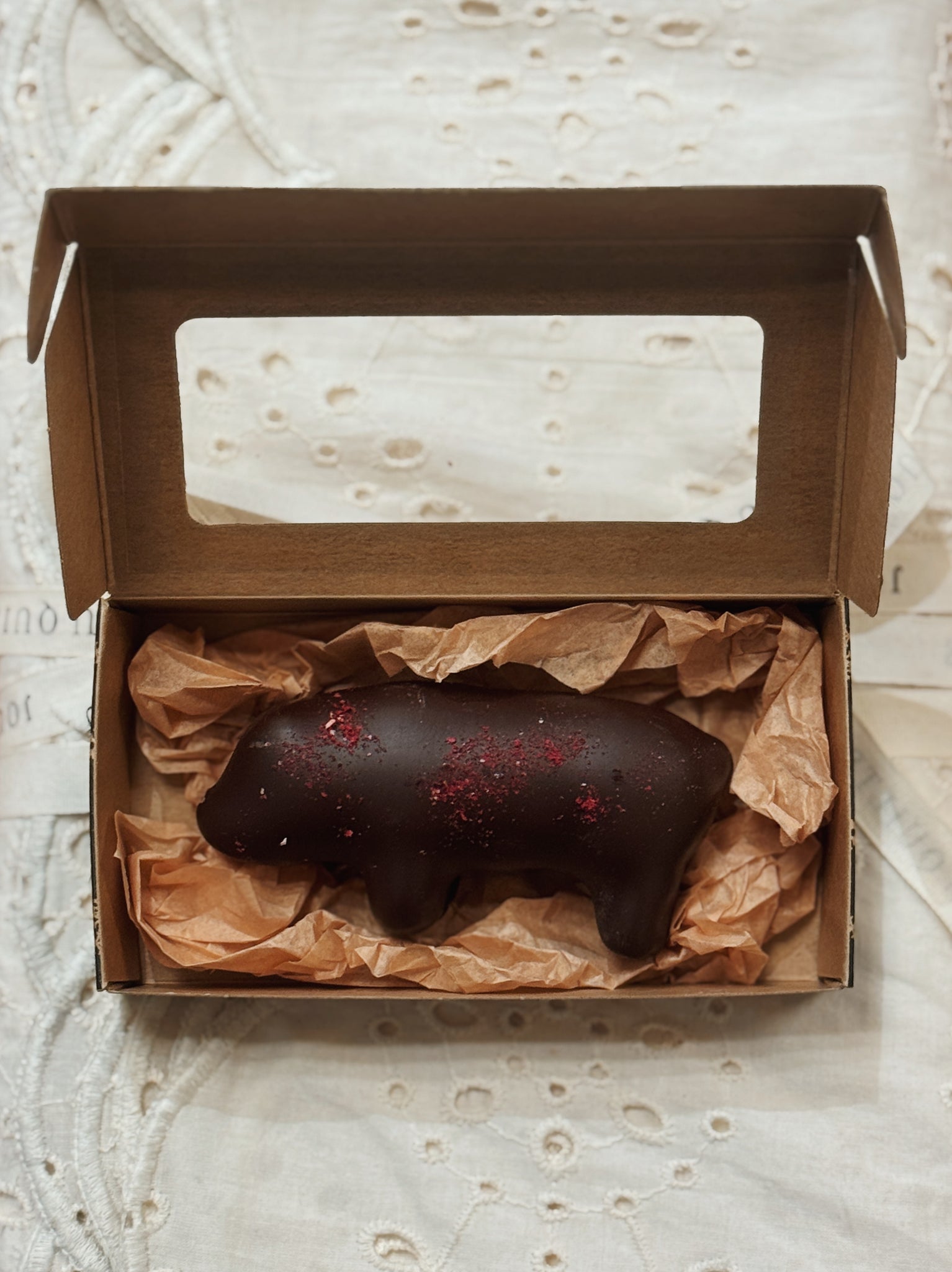 En klassisk marcipangris i den fineste lille gaveæske – håndlavet med et generøst lag mørk Ecuador 70% chokolade og drysset med hindbærpulver. En elegant og velsmagende version af den elskede julefavorit.