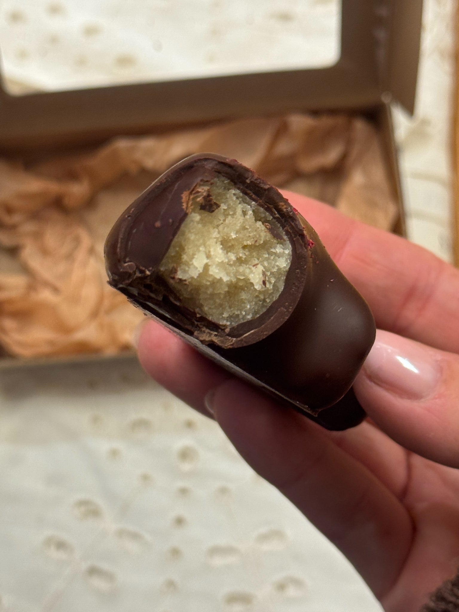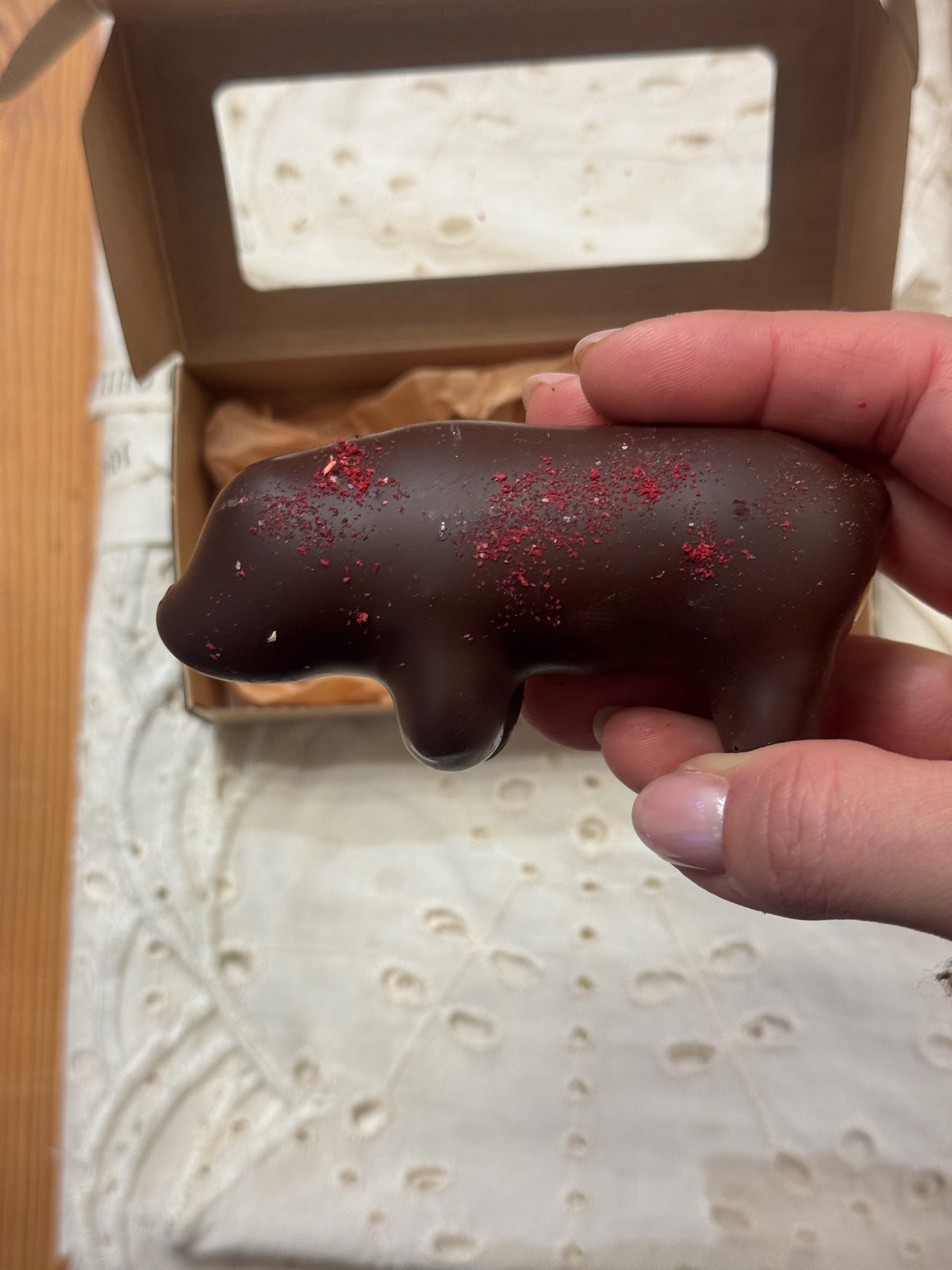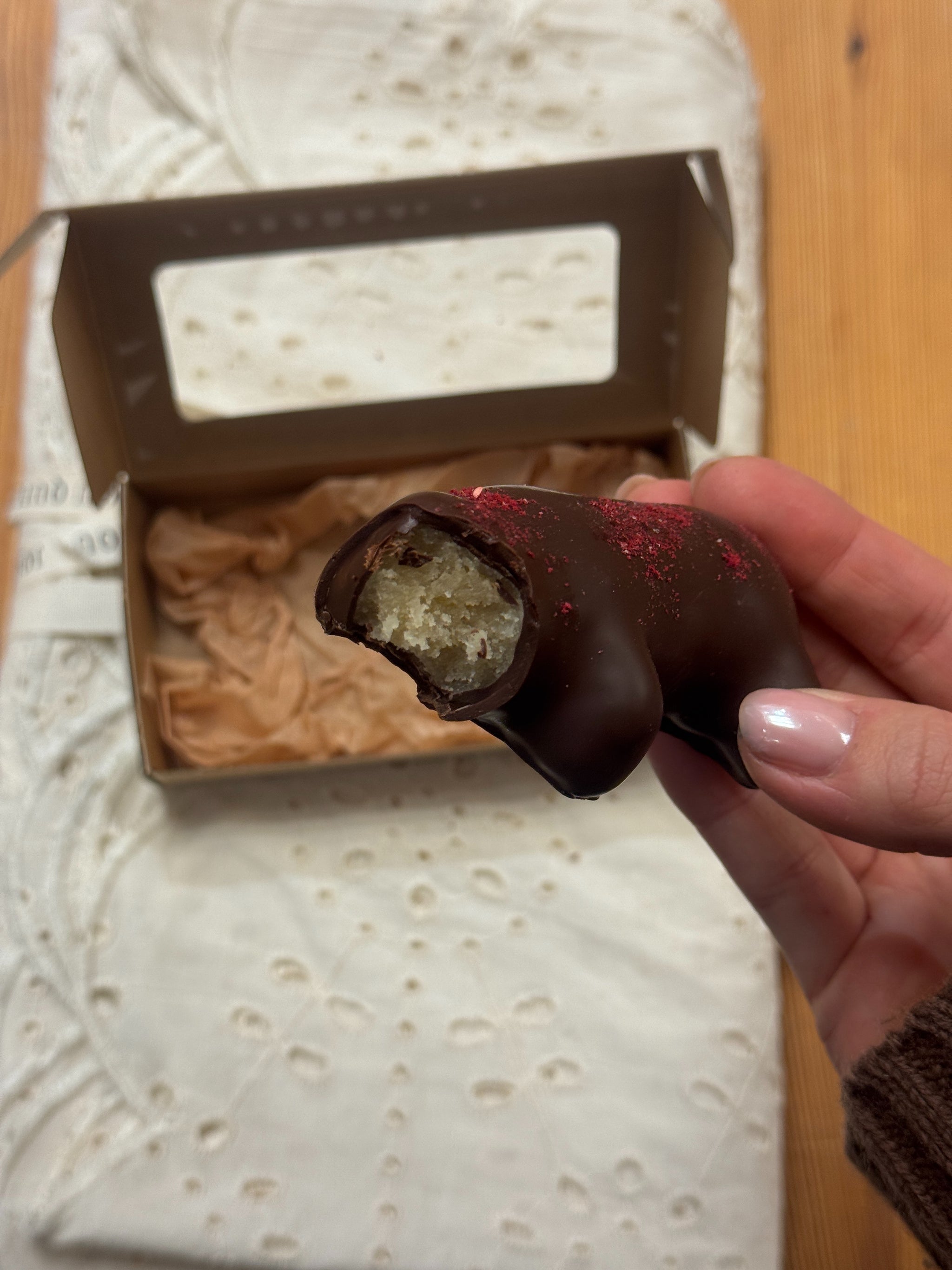 En klassisk marcipangris i den fineste lille gaveæske – håndlavet med et generøst lag mørk Ecuador 70% chokolade og drysset med hindbærpulver. En elegant og velsmagende version af den elskede julefavorit.