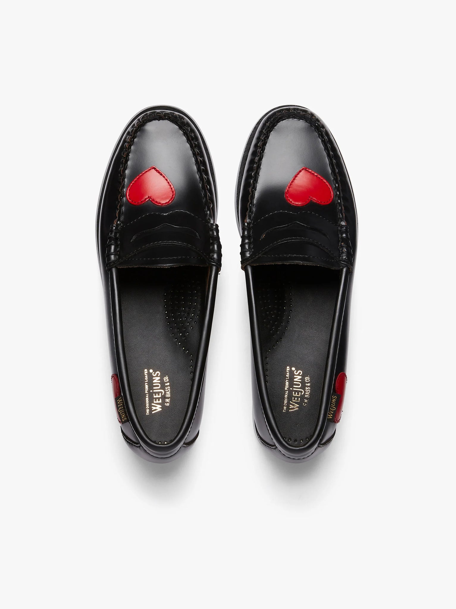 G.H. Bass Penny Love Weejuns er et par klassiske sorte penny loafers med fine, ikoniske læderhjerter. Skoen er udført i blankpoleret læder med slip-on design og håndsyede detaljer. Det dybrøde hjerte står smukt mod den sorte baggrund og giver et diskret, men karakterfuldt udtryk.