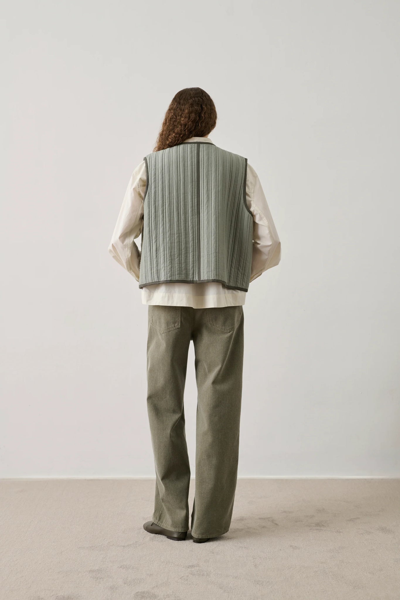 Denne vest fra Soeur er udført i en let polstret kvalitet med fine, lodrette quiltede stikninger, der giver et smukt og struktureret udtryk.