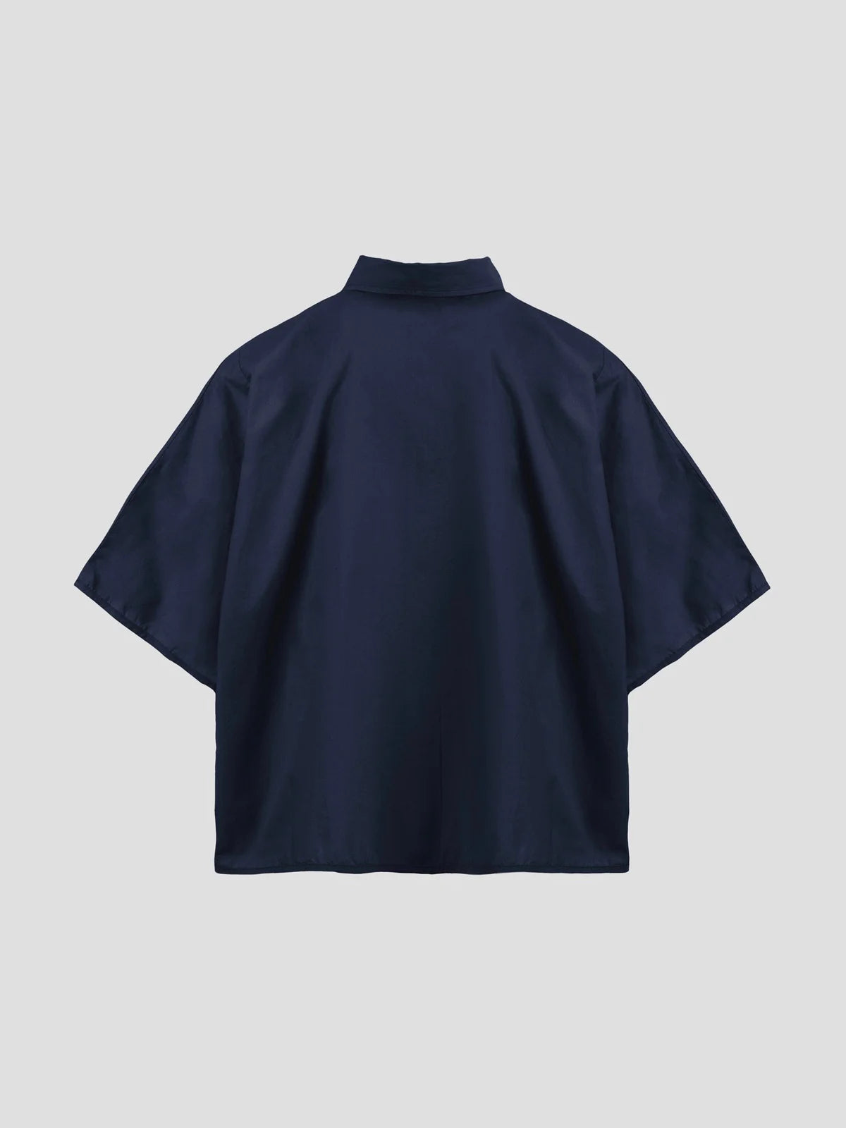 Skjorten er designet med løs silhuet, korte ærmer uden ærmegab, klassisk skjortekrave og tone i tone knapper.